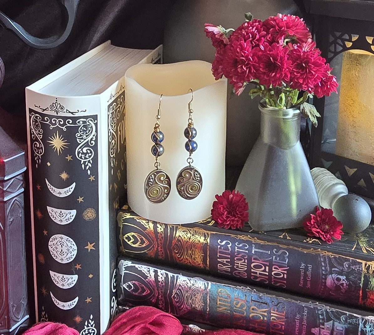 ✦ Materials: Sapphire-colored Impression Jasper beads & brass triskelion charms wrapped in brass color copper coated wire
