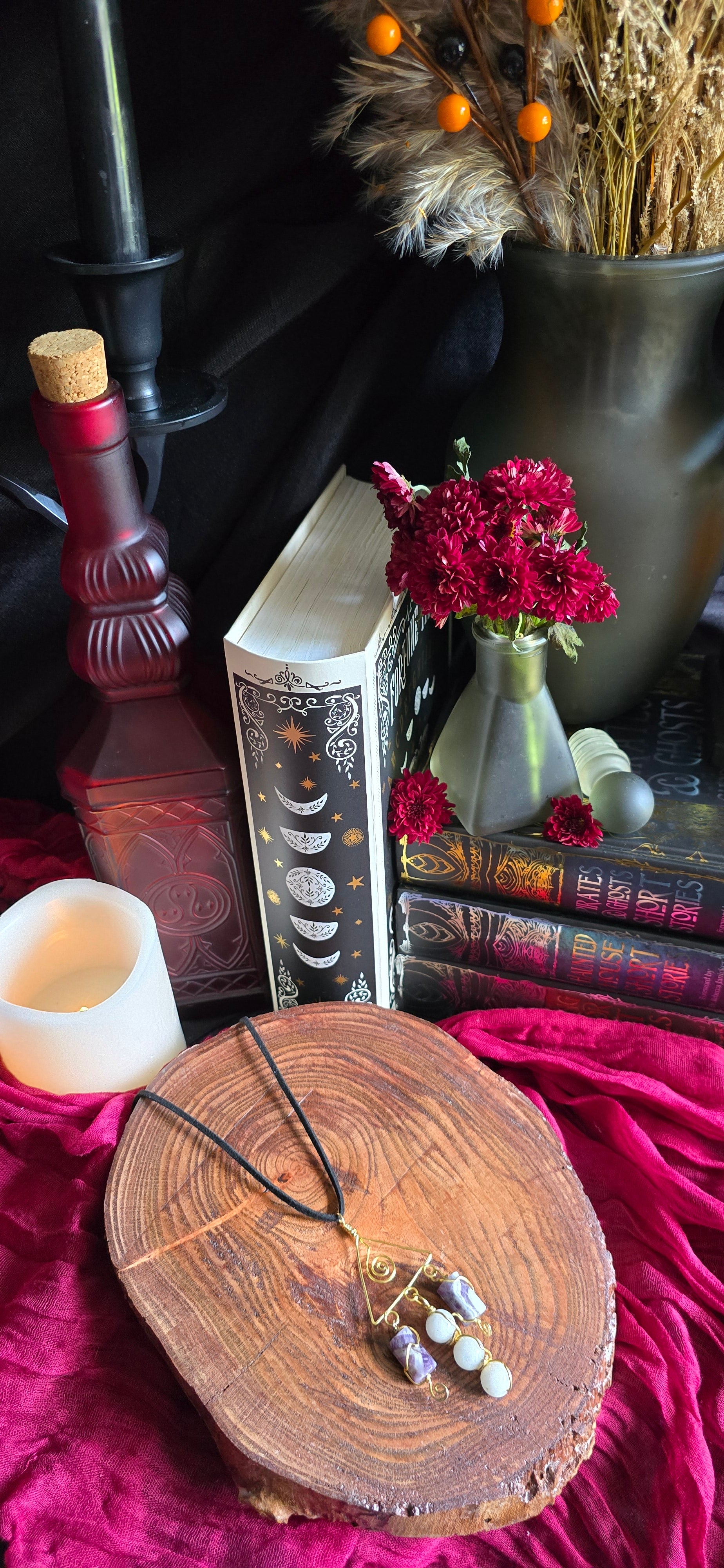 Delicate yet radiant, Enchanting holds a playful blend of divine energy & grounded beauty. Hand-formed in a gold color copper coated wire triangle, this pendant features Morganite & Amethyst beads, a union of heart & crown energy that bridges love & intuition.