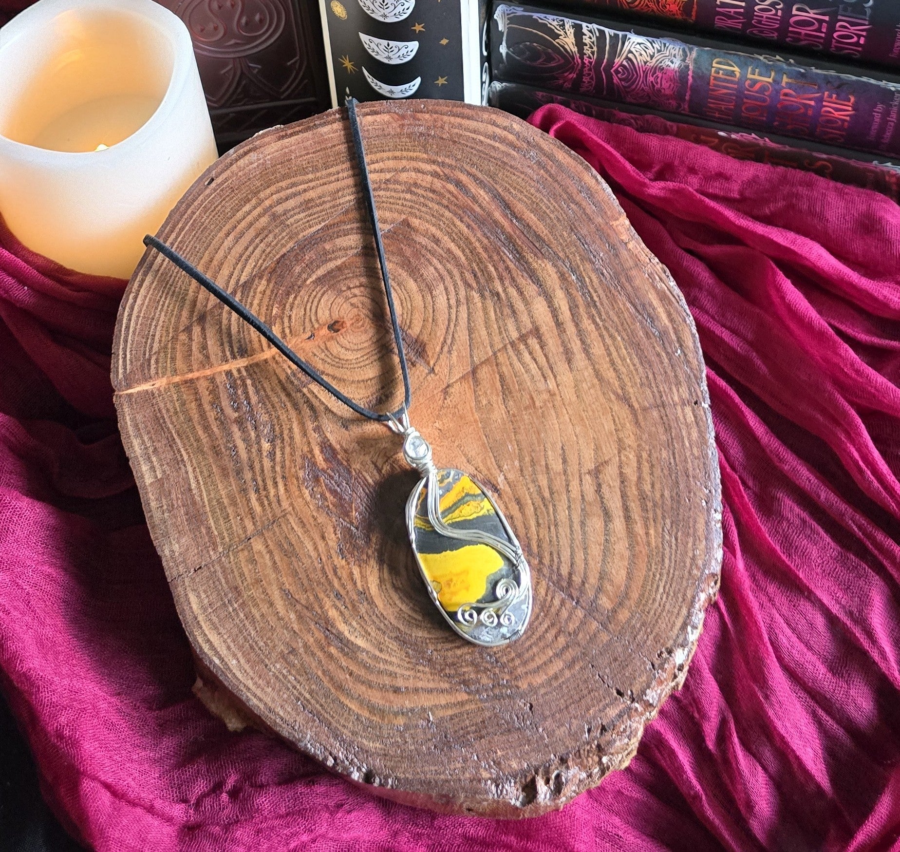 Radiant, grounding, & full of life, Herkimer Honey unites the sweetness of the earth with the clarity of the stars. This one-of-a-kind Bumblebee Jasper pendant wrapped in silver color copper coated wire is crowned with a Herkimer Diamond, creating a powerful combination of focus, confidence, & illumination.