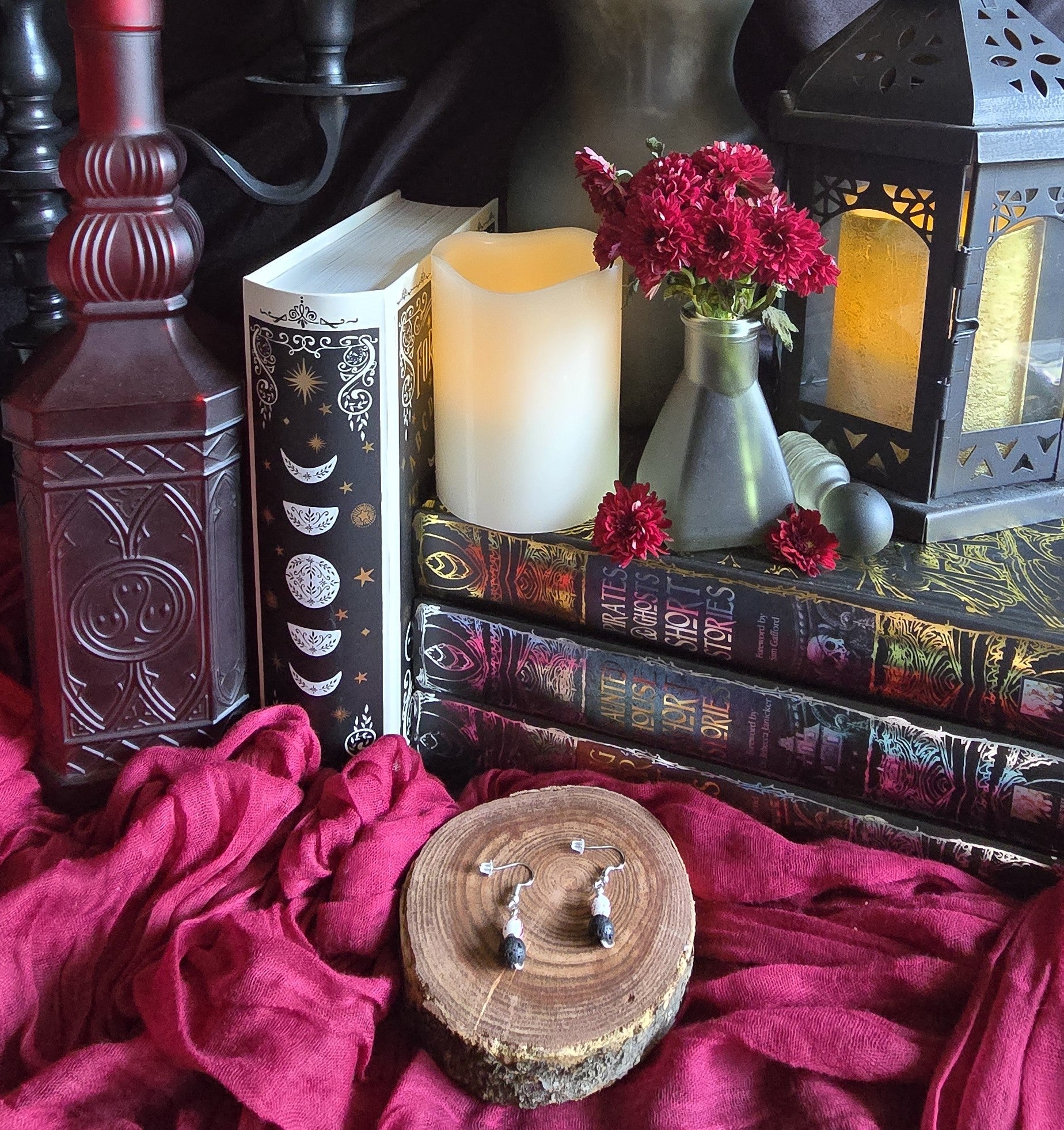 Mysterious yet playful, the Haunted Hallows Earrings were made for those who carry a little mischief in their magic. Each pair features glass beads flecked to resemble eerie blood spatter paired with a lava bead ready to hold a drop of your favorite essential oil. Together they blend the essence of spooky season style with a touch of mindful aromatherapy.