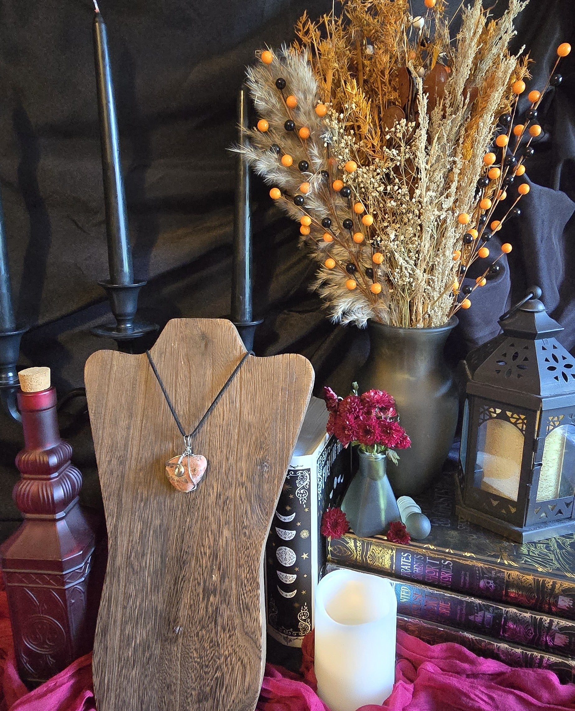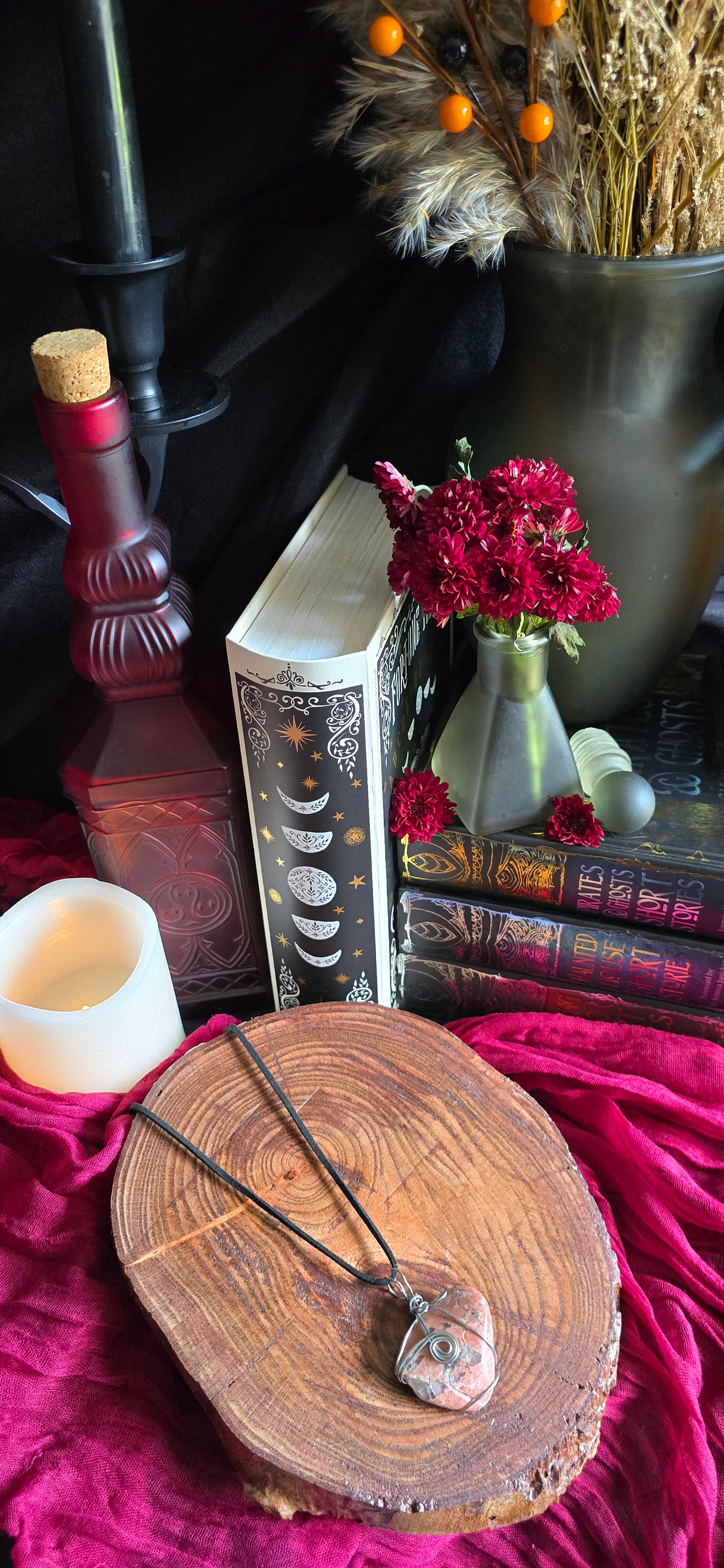 Bold yet gentle, Heart of Glass captures both resilience & transparency. This South Dakota Red Feldspar pendant, wrapped in silver color copper coated wire, shines with a deep inner glow that reflects courage through vulnerability.