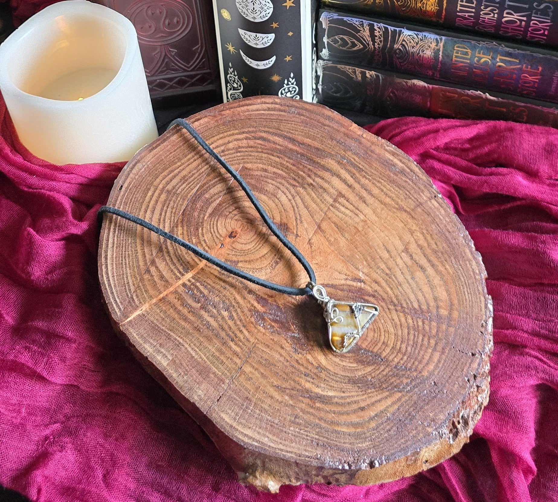Powerful yet grounding, Mountain Spark embodies the strength to rise through challenge while staying anchored in truth. This one-of-a-kind triangle-shaped Yellow Tiger’s Eye pendant is wrapped in silver color copper coated wire, forming a mountain design that symbolizes endurance, stability, & faith in your own climb.