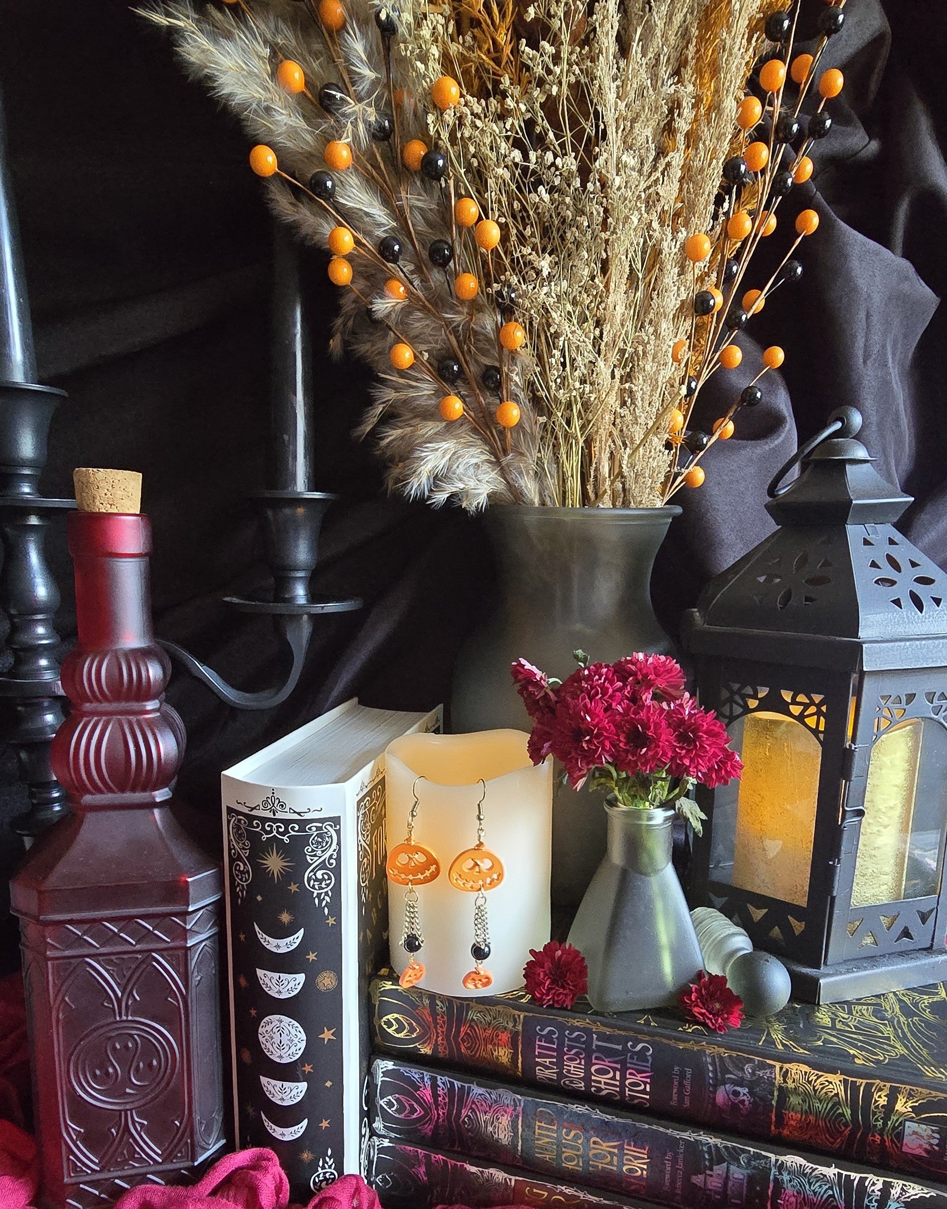 Agate Jacks pair the cheerful pumpkin faces with gold chain & a black agate bead, grounding joy in calm confidence.