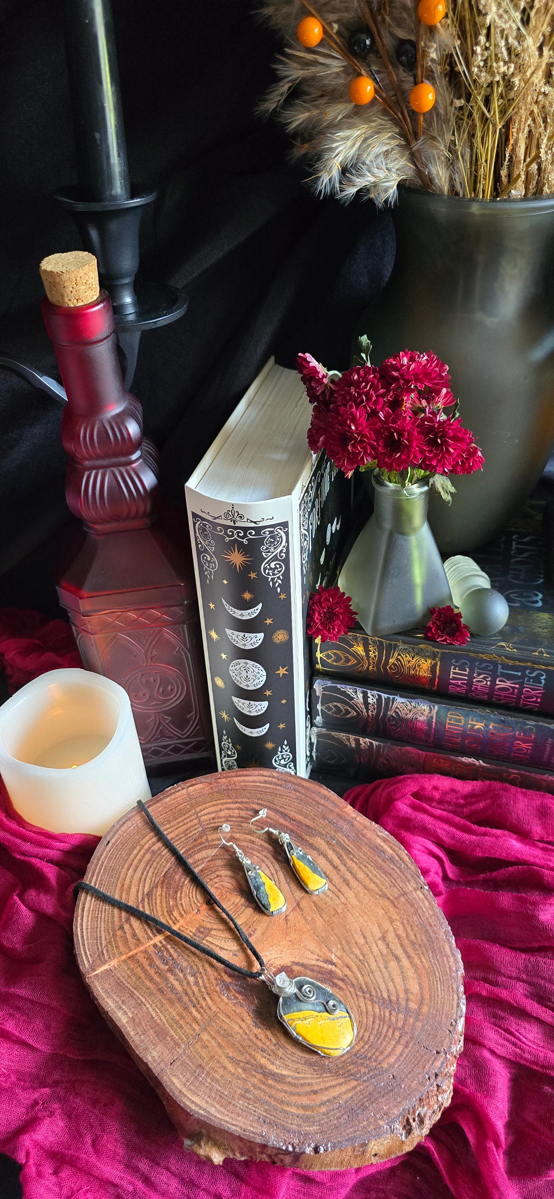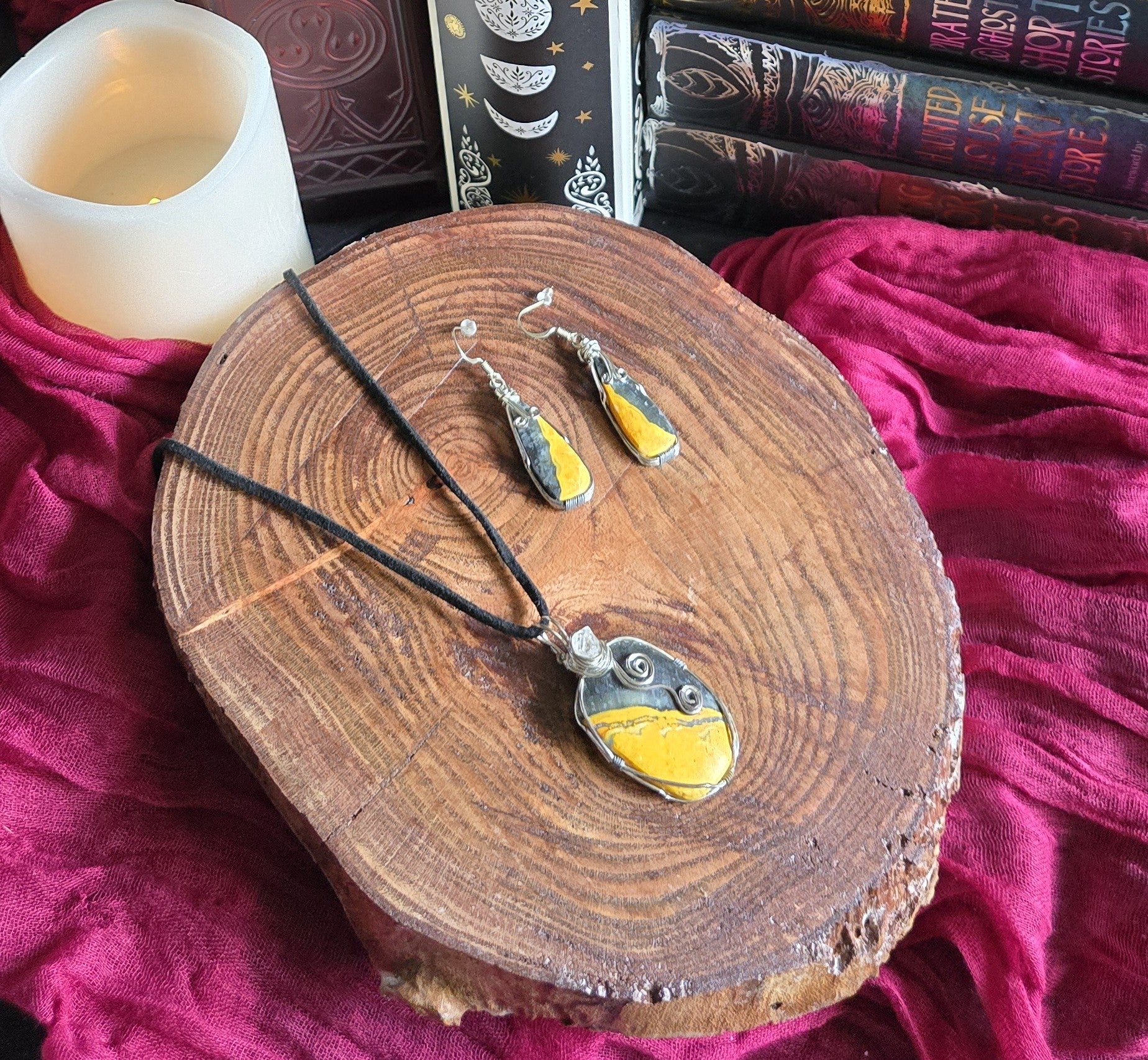 Alive with fire & grounded grace, Resounding Radiance is a one-of-a-kind Bumblebee Jasper pendant & necklace set that captures both the vitality of the earth & the clarity of the cosmos. Wrapped in silver color copper coated wire, this piece features a Bumblebee Jasper cabochon paired with a Herkimer Diamond, forming an energetic bridge between transformation, joy, & divine connection.