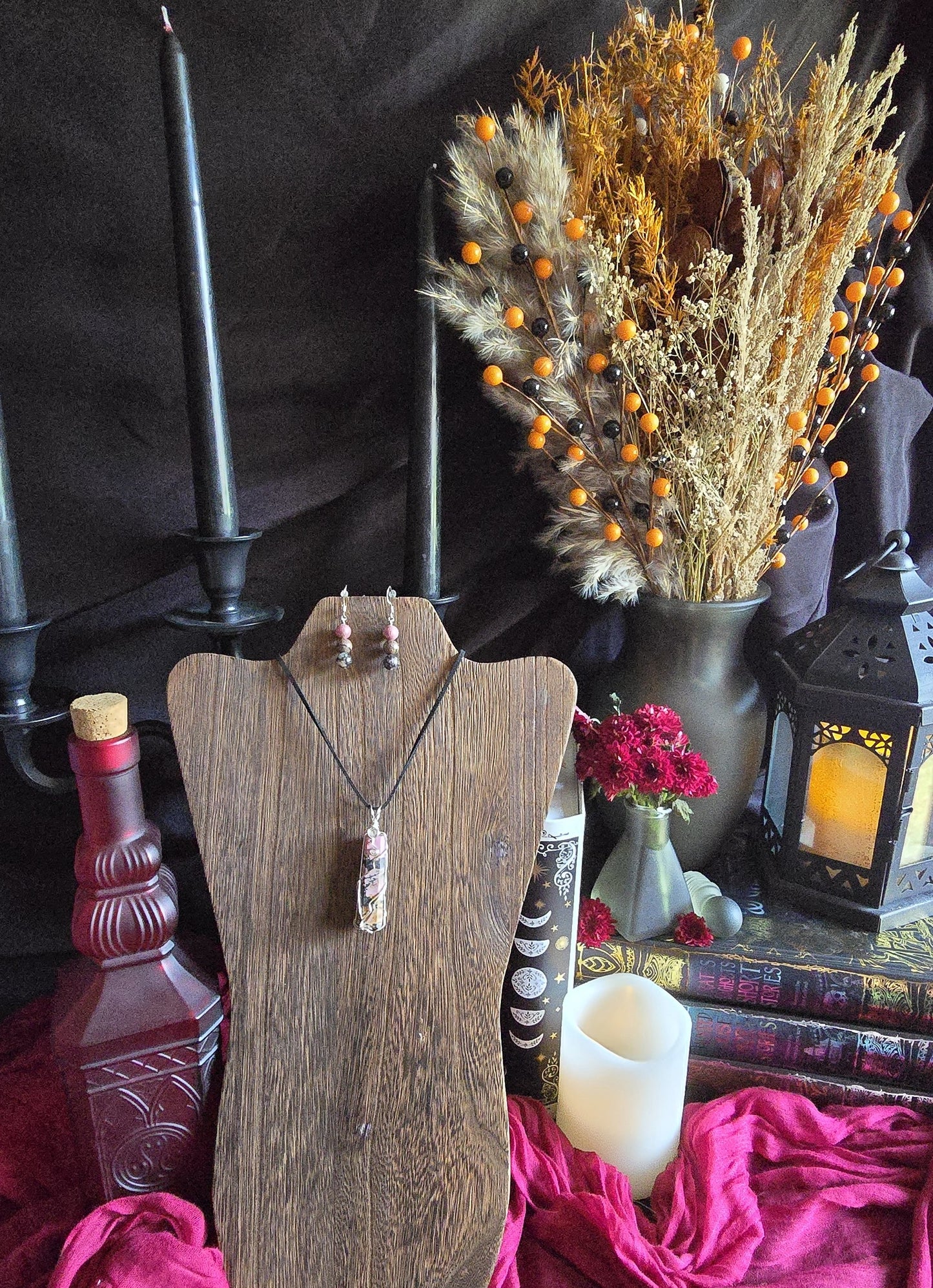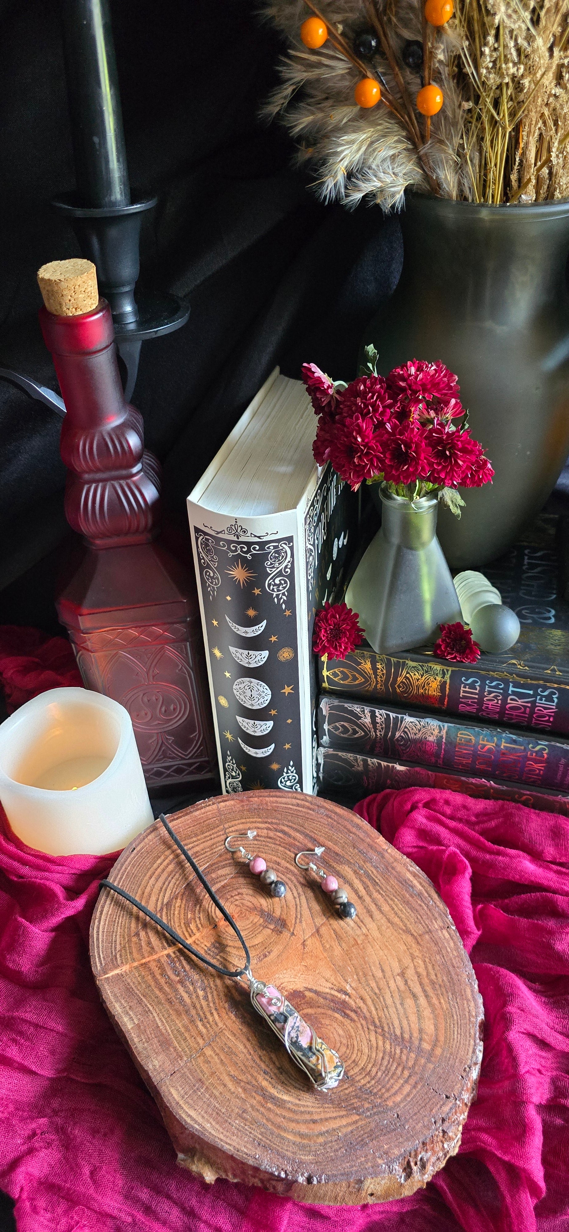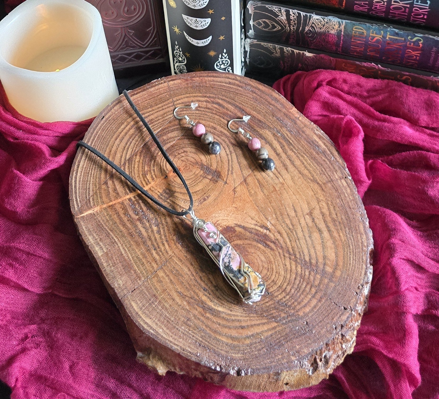There’s a sacred strength in softness & Rosey Balance embodies that beautifully. This pendant & earring set was designed to help you hold compassion in one hand & boundaries in the other. Handcrafted with care, this piece features Rhodonite stones & beads wrapped in silver color copper coated wire, blending gentle heart energy with grounded stability.