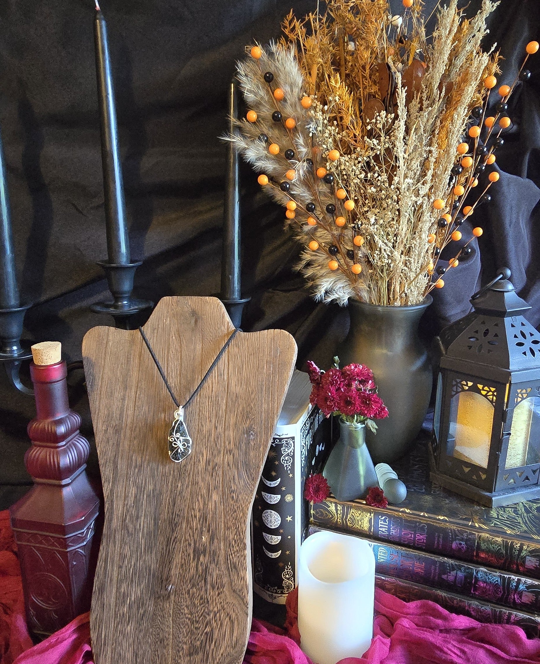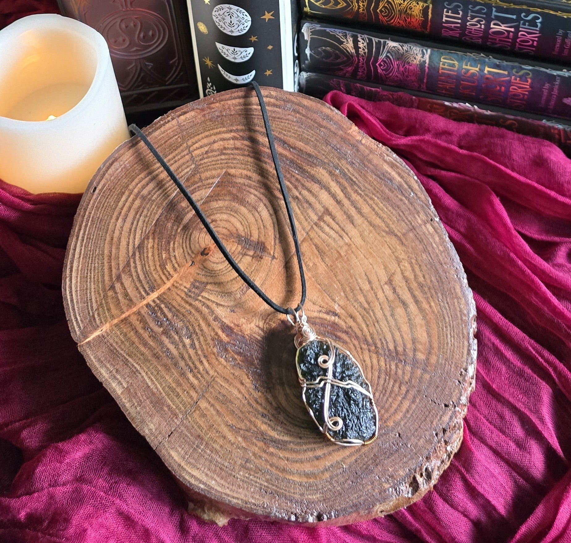 Hand-wrapped in luminous Argentium Silver, each curve of wire was shaped to honor Moldavite’s natural form while allowing its cosmic energy to flow freely. The result: A radiant contrast of green fire & silver moonlight, a true catalyst for your personal evolution.