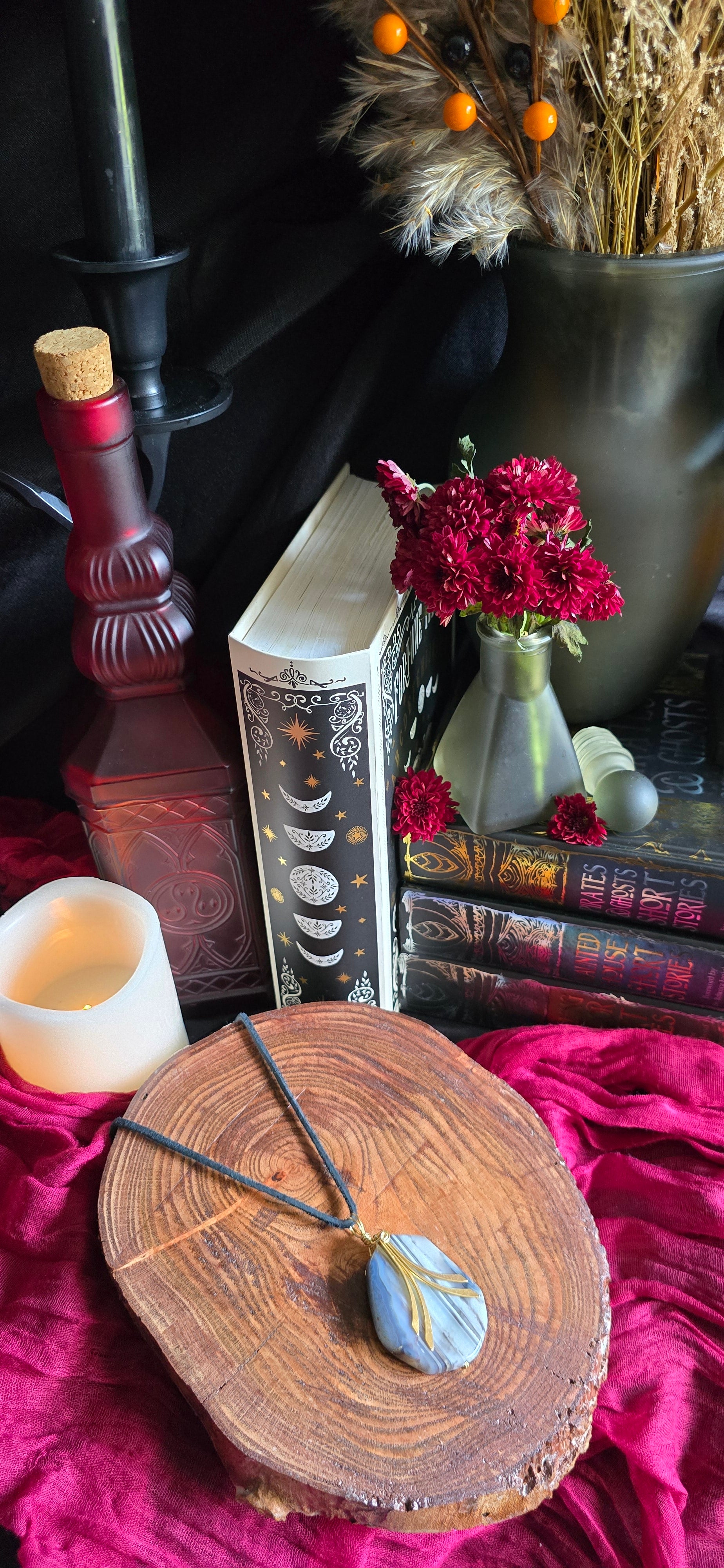 Balanced between calm & chaos, Storm Bringer’s Harmony teaches the art of peace within transformation. This gray banded Agate pendant is elegantly embellished with repurposed brass charms, a minimalist design that speaks volumes through quiet strength.