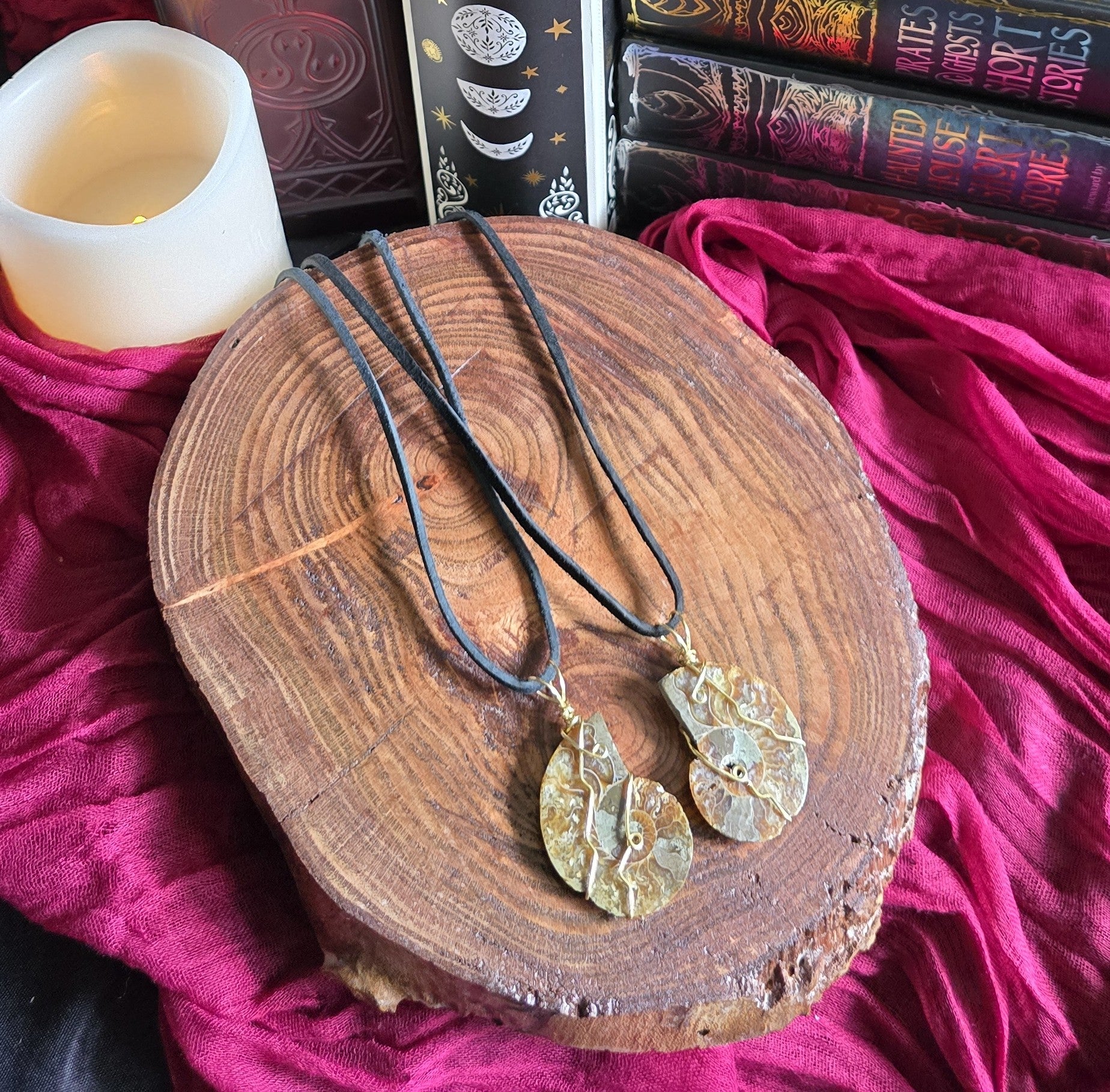 Bound by nature, Unity celebrates love that transcends time. These Ammonite fossil halves, wrapped in gold color copper coated wire, are part of my Duos Collection: pendants made to be shared, representing two souls forever intertwined.